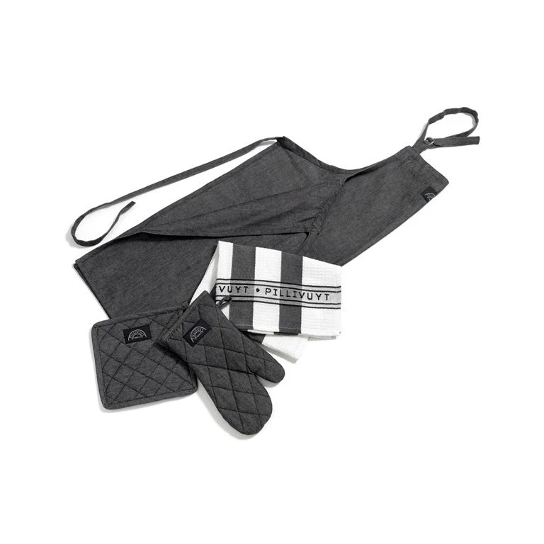 Kokkeforklæde, grillhandske, 2 grydelapper og 2 viskestykker