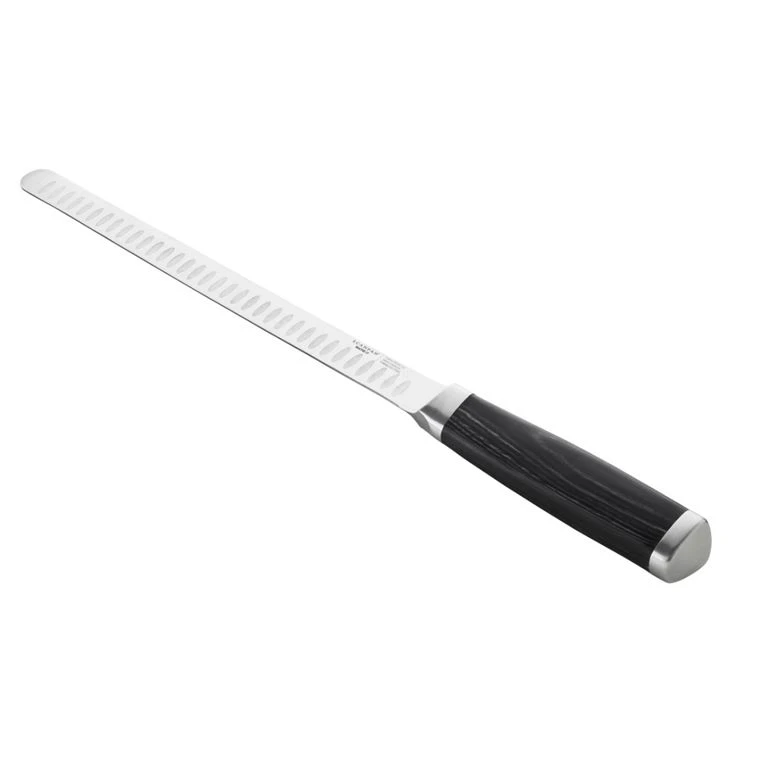 Det lange fleksible blad med riller for reduceret friktion gør kniven velegnet til serrano- eller parmaskinke samt skæring af tynde skiver fisk. Håndtaget er fremstillet af pakkatræ og er vandvisende og kan dermed ikke optage fugt.