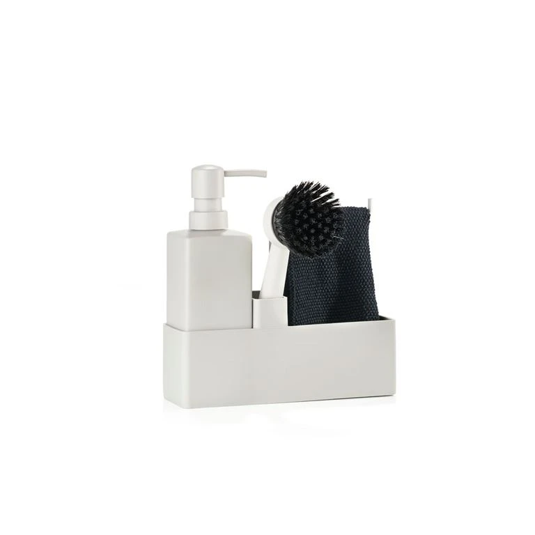 En holder, en opvaskebørste, en karklud samt en sæbedispenser